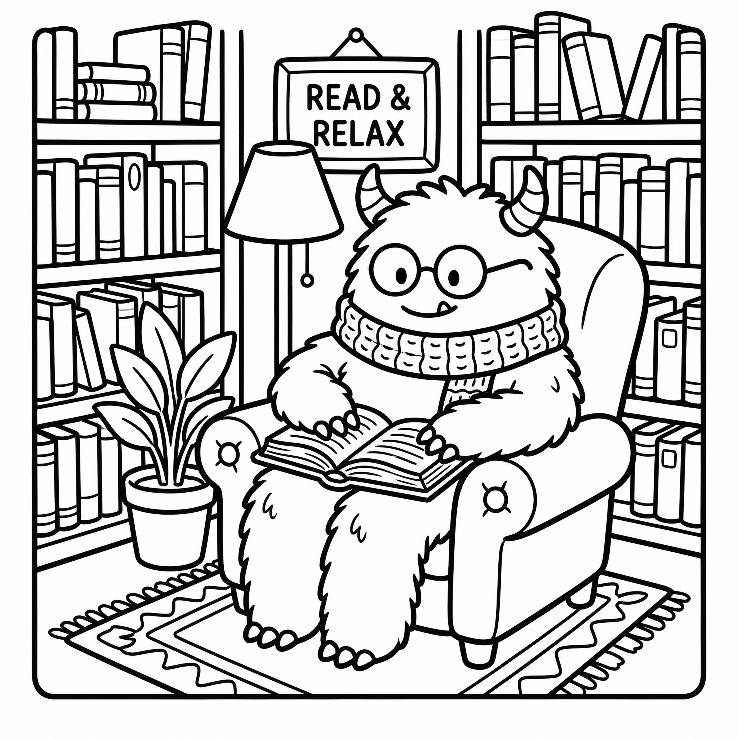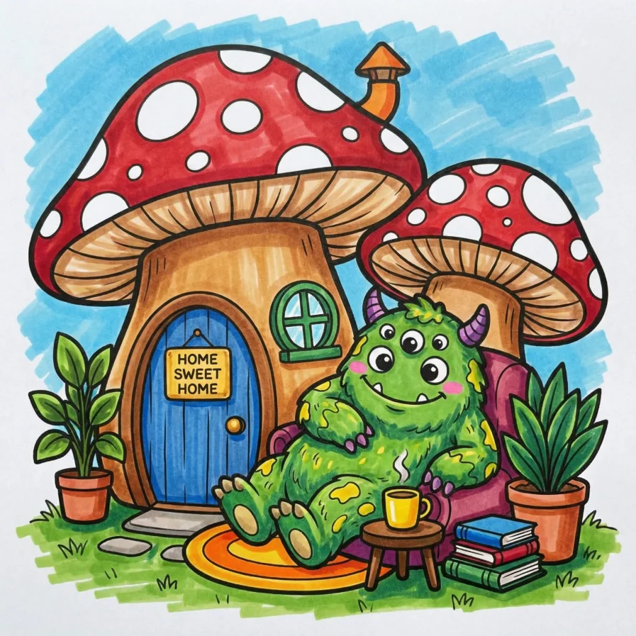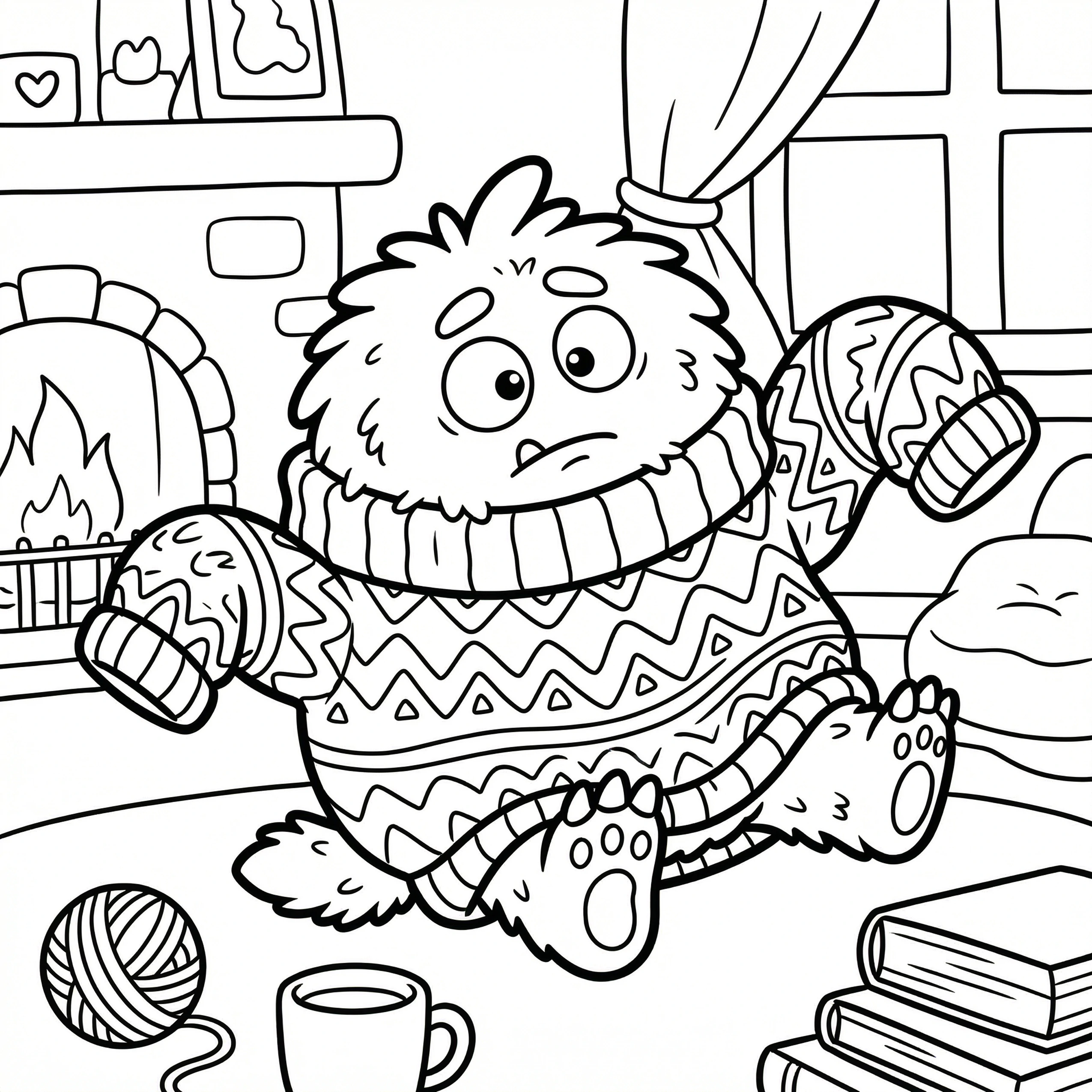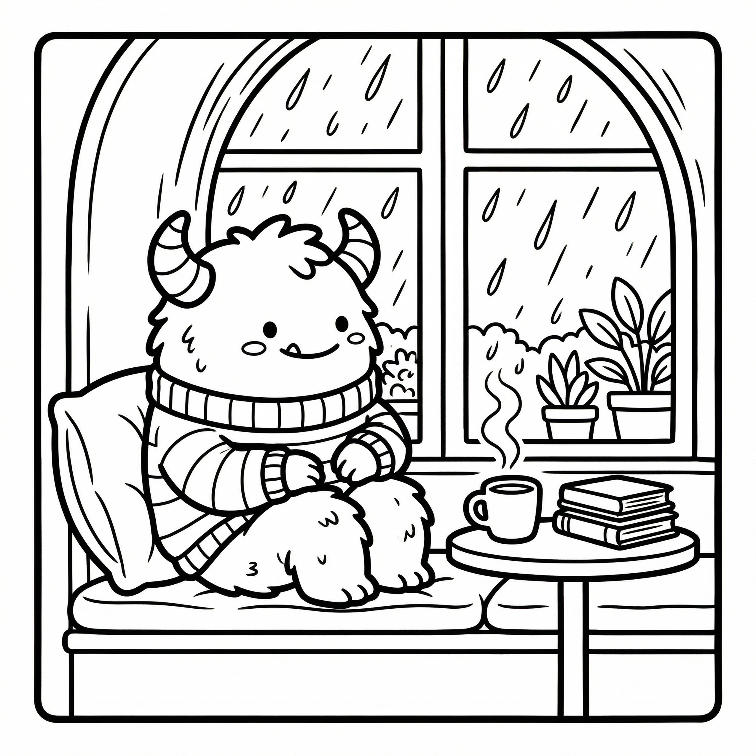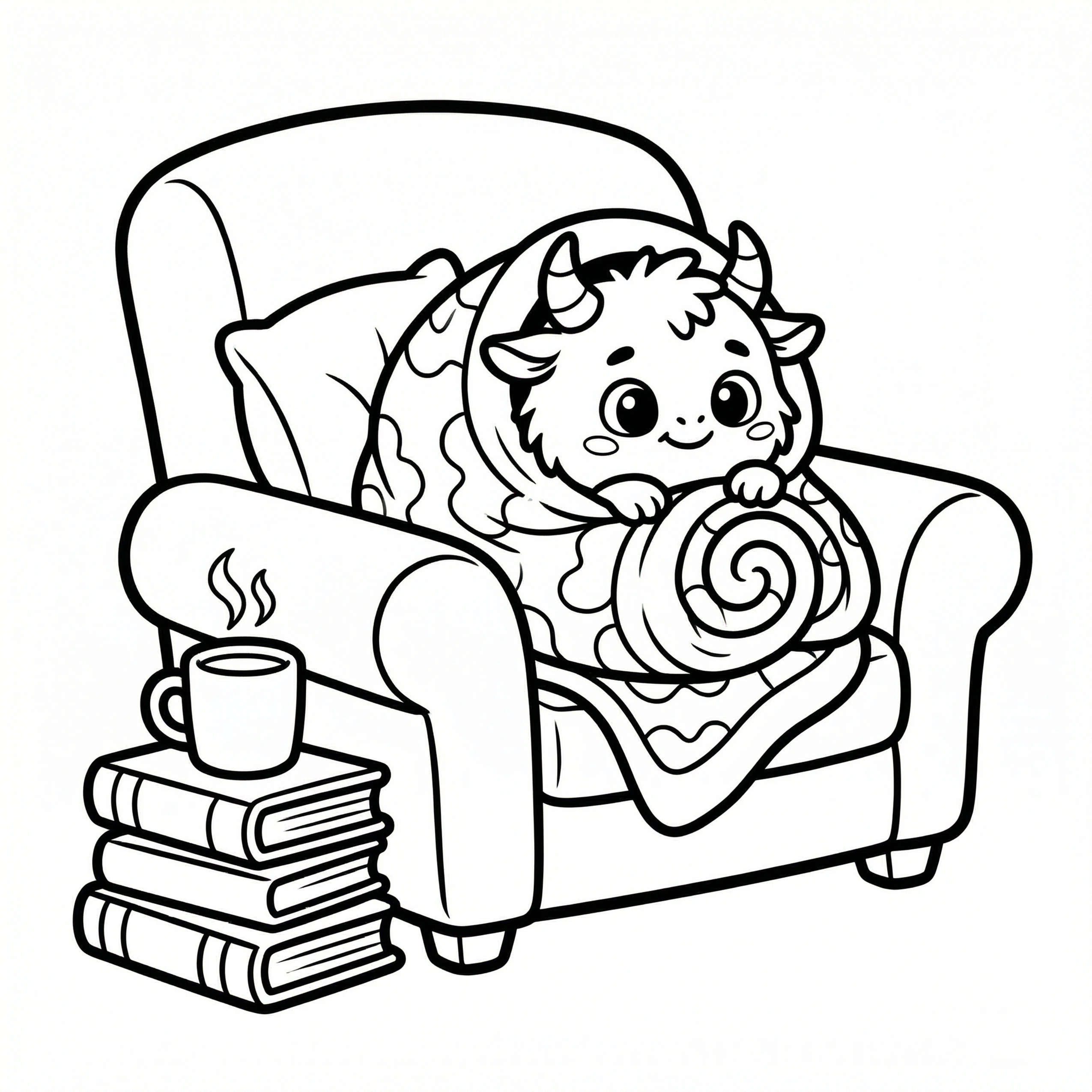 Little Monster Cozy Corners Coloring Pages, Simple & Bold Designs of Cute Monsters in Sweet, Funny, and Peaceful Places