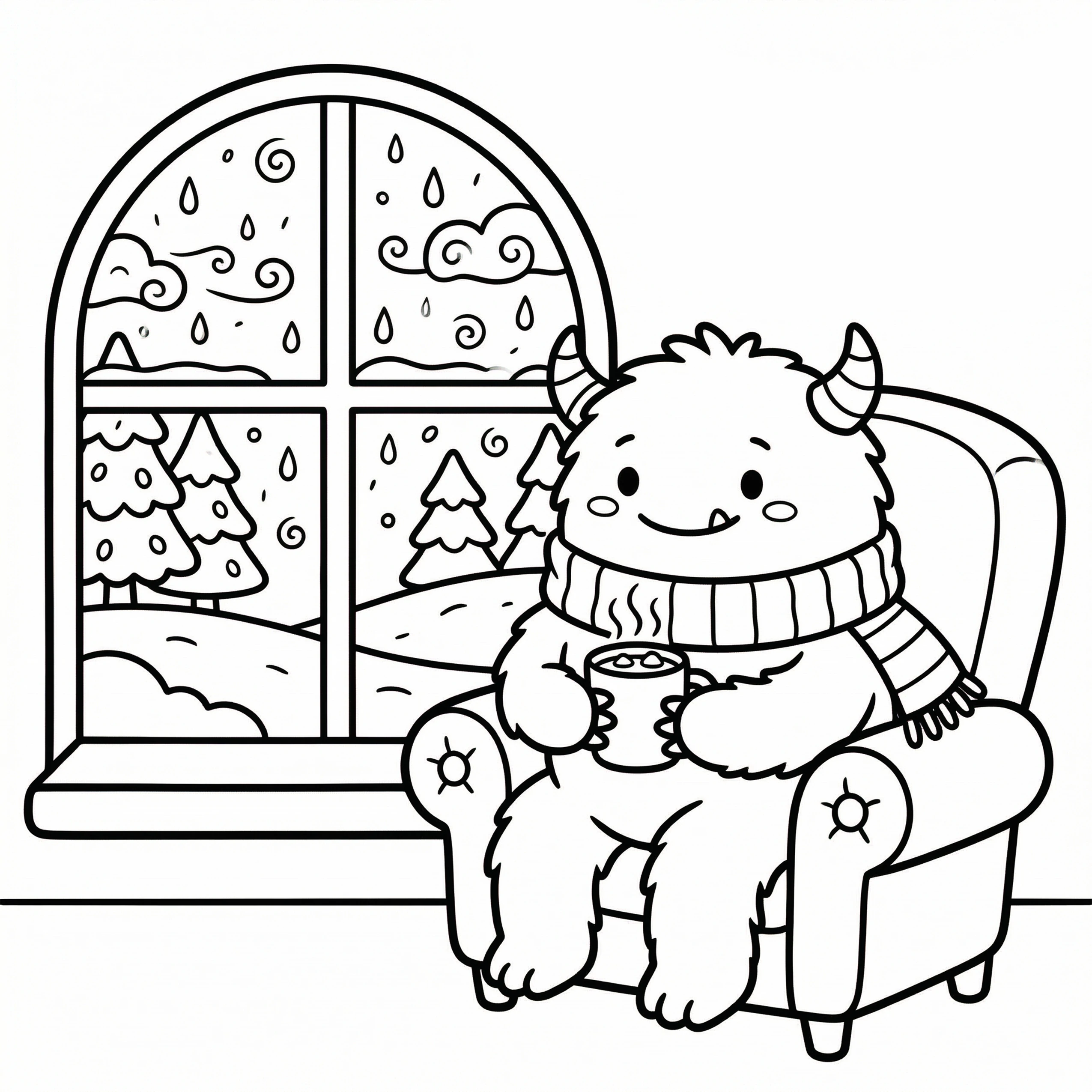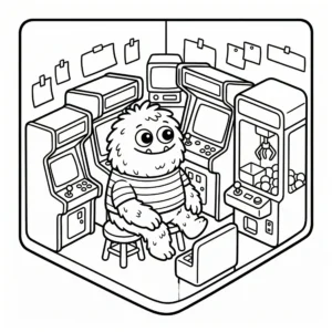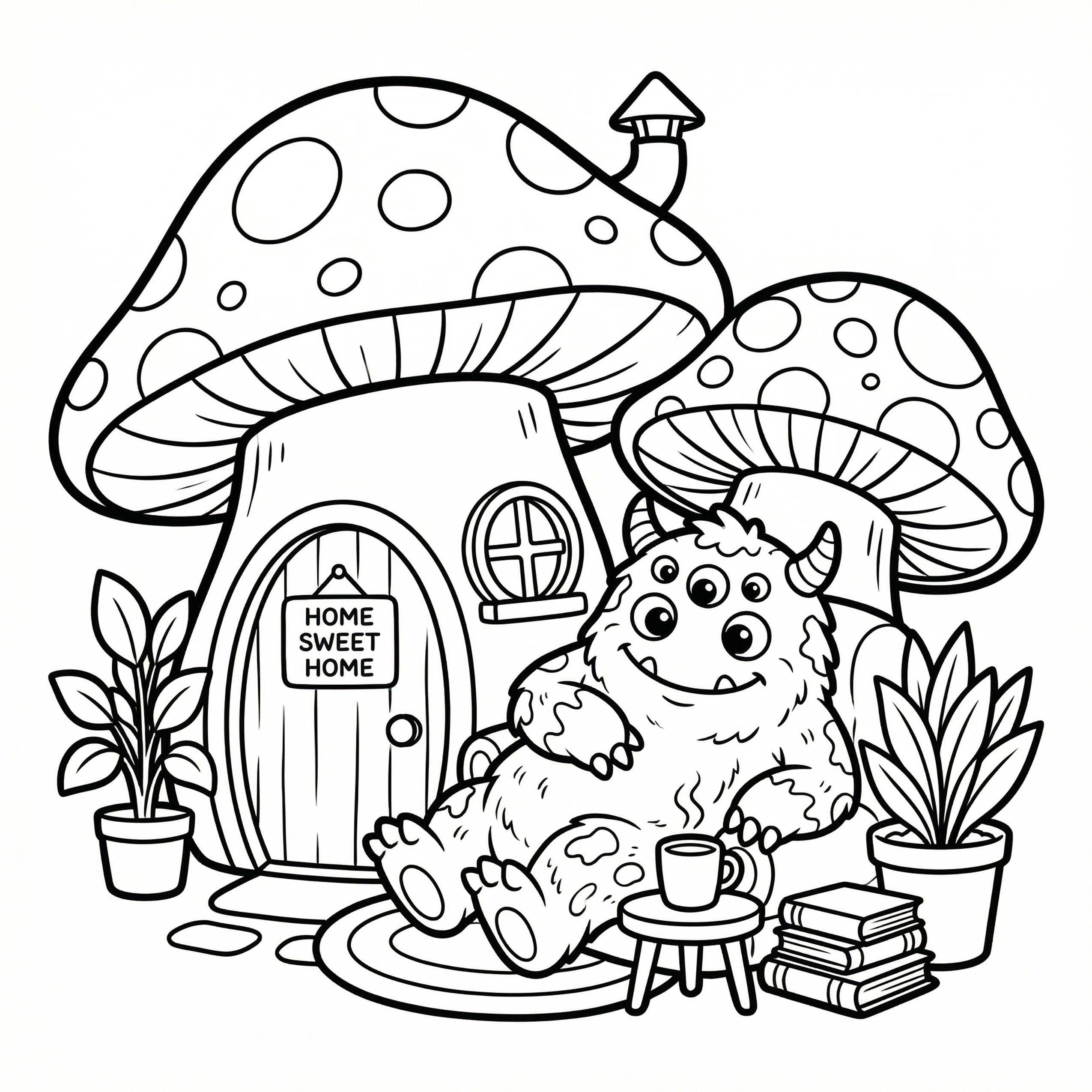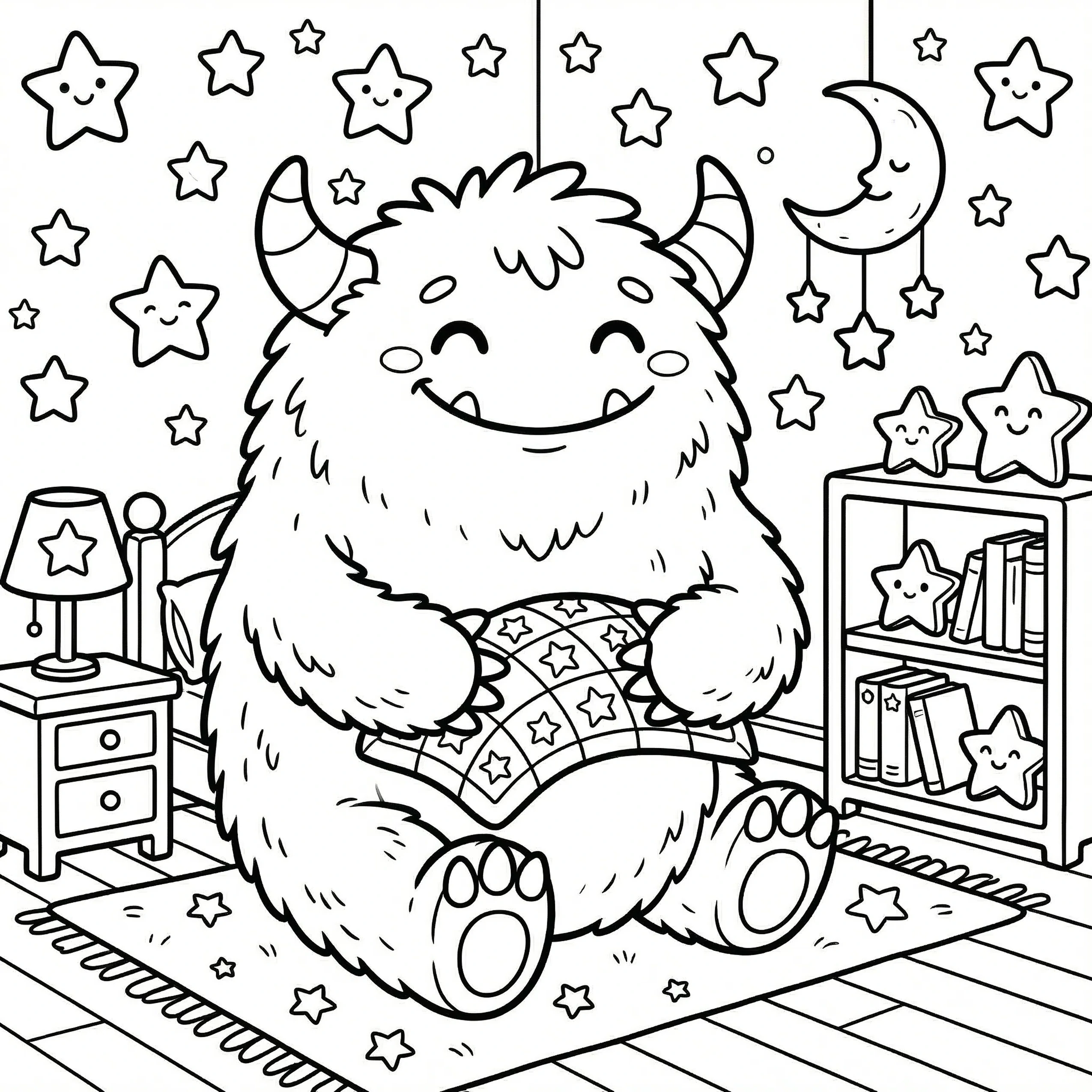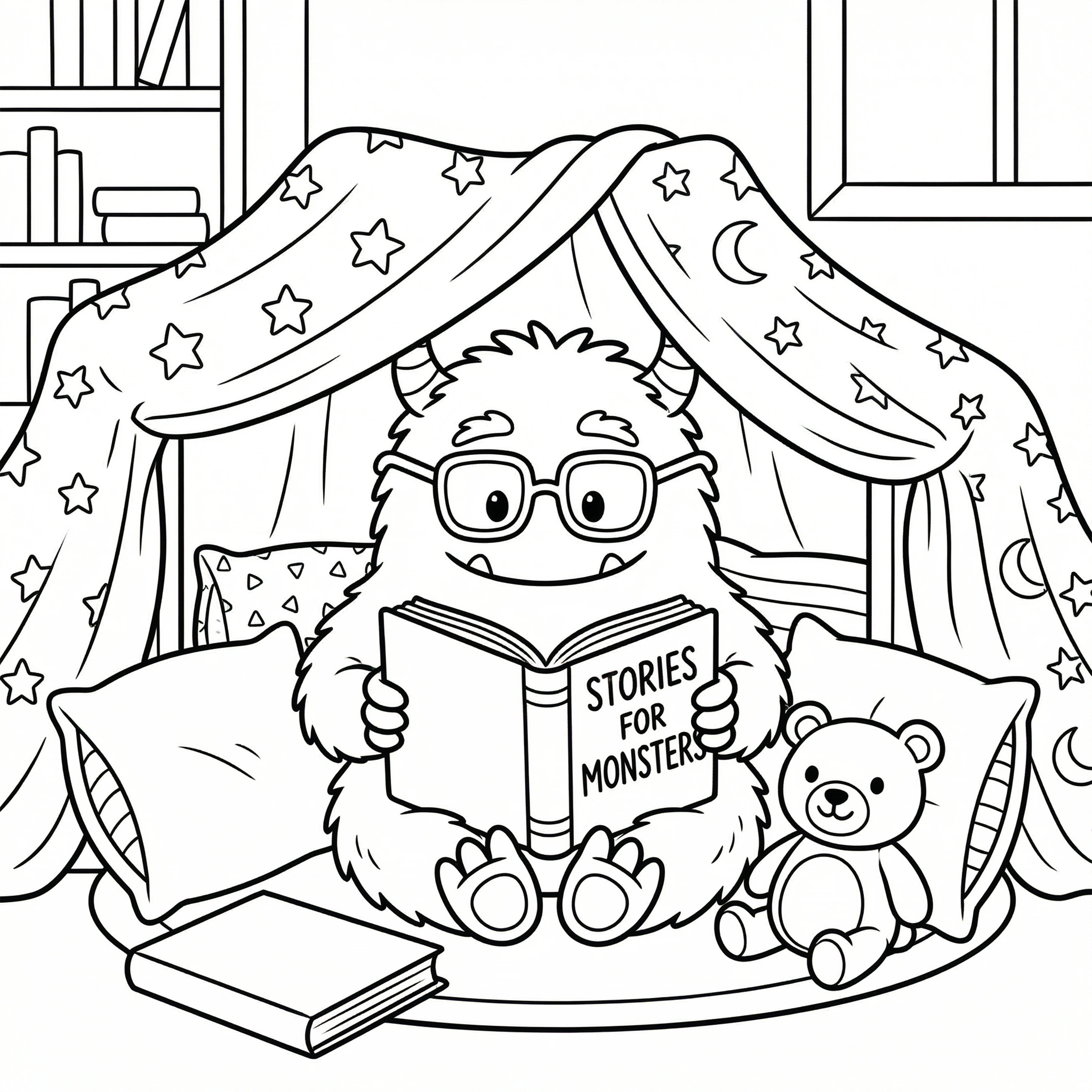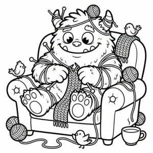 Little Monster Cozy Corners Coloring Pages, Simple & Bold Designs of Cute Monsters in Sweet, Funny, and Peaceful Places